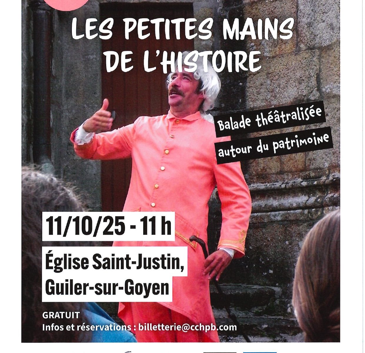 Cet automne, la Communauté de Communes du Haut Pays Bigouden vous propose de (re)découvrir le patrimoine au travers de balades théâtralisées qui se dérouleront dans les dix communes du territoire. “Les Petites Mains de l’Histoire” est un projet de spectacle de rue, qui propose aux publics de découvrir le patrimoine de leur commune sous un angle nouveau. Le public s’élance dans les rues… Mais la déambulation se voit rapidement animée par l’apparition intempestive de personnages illustres, petites gens et autres fantômes en tous genres. La grande Histoire fait ainsi irruption dans la petite, avec une bonne dose de jeu, d’humour, d’anachronisme assumé et d’échos subtils aux bouillonnements de notre temps.